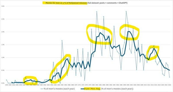 Analysis of popular films for males and release dates shows that there have been two epic periods for movies that appeal to males (the biggest one during the 1980s, and another just before the turn of the century), along with three important periods for depiction of masculinity (the end of WWII, early 1960s, and the early 2010s):