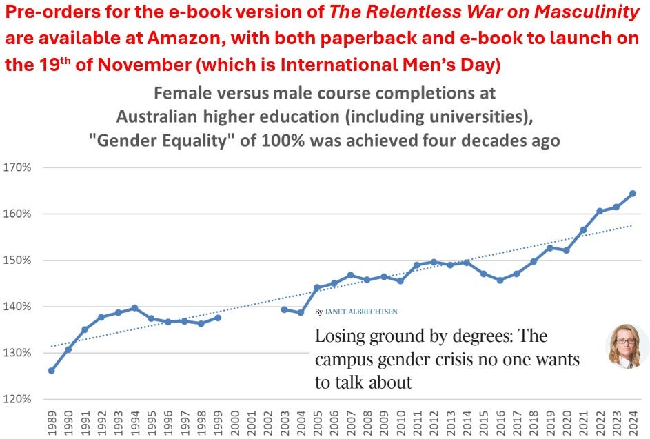 Women overtook men at Australian university campuses in 1987, which is four decades ago. In 2023 there were 61% more female course completions than male. Which rose to 64% more women graduates than men graduates in 2024... We are moving away from gender equality, not towards it.